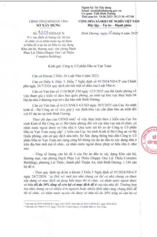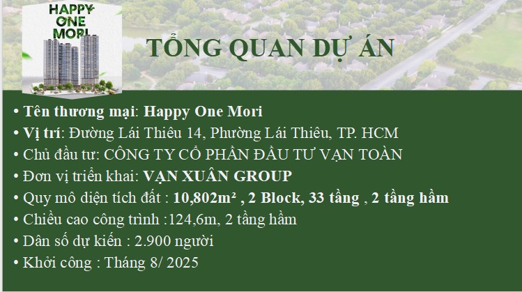 • Sáng ngày 09/08/2025, Vạn Xuân Group đã chính thức khởi công dự án HAPPY ONE MORI với quy mô 1.441 sản phẩm kèm theo tiện ích xanh, hiện đại và pháp lý minh bạch tại phường Lái Thiêu, TP. HCM.